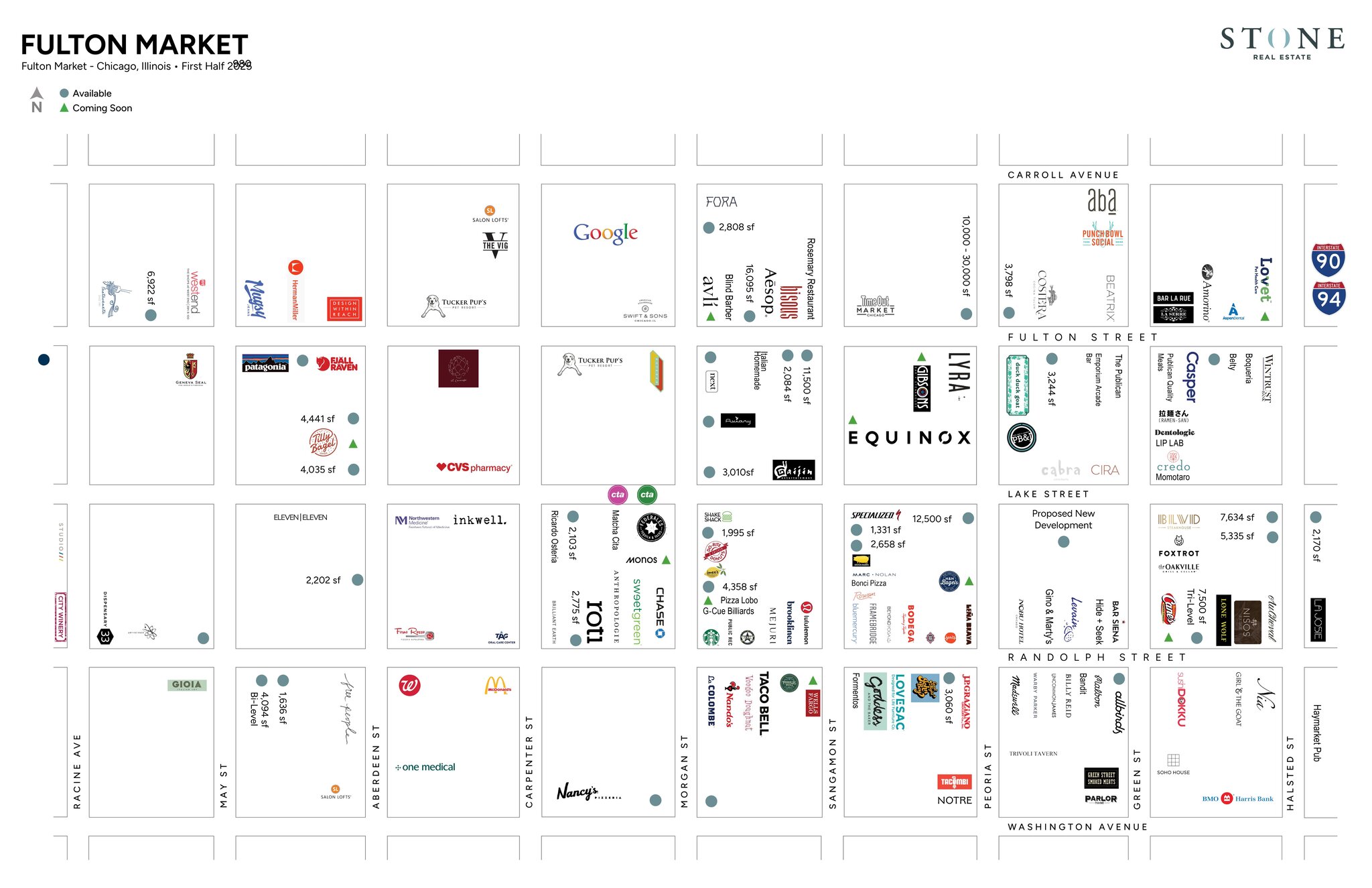 Over the last 10 years, Fulton Market has garnered national recognition as Chicago’s most interesting trade area. While known for its fantastic restaurants and wonderfully unique hotel experiences, Fulton Marked has been slow to establish a reputation as a great place to shop. Data gathered by Stone Real Estate Corp. explains why this perception exists. Of the 1.4M SF of ground level retail inventory existing in the market, 529,000 SF of it is comprised of Food & Beverage.