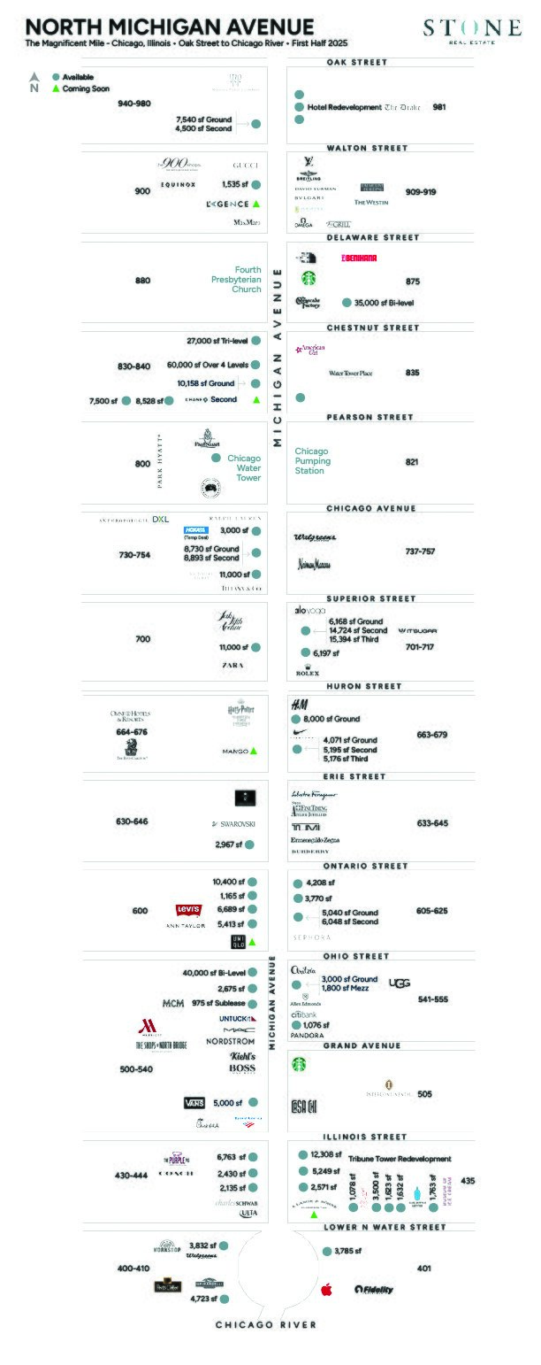 The Harry Potter Experience Store has opened to strong demand, while A. Lange & Söhne has begun construction at Tribune Tower. Mango and Uniqlo are expected to start work soon, and The North Face has signed to relocate to 605 N. Michigan Avenue. Prime corners, including the former AT&T and Coach spaces, are drawing retailer interest.