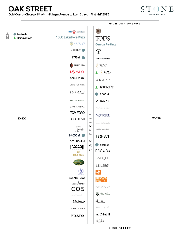 Oak Street’s clientele includes high-income residents, affluent tourists, and even celebrities, drawn by the street’s luxury mix and high-end ambiance. Foot traffic remains steady throughout the week, with heightened activity on weekends due to the nearby Rush Street